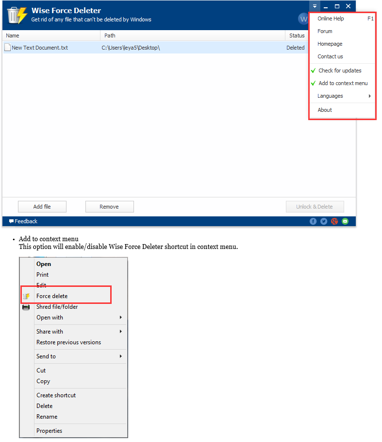 Context Menu Option Wise Force Deleter allows you to access it via a context menu. Right after installing it, a new option named “Force Delete” will appear in the context menu. To unlock&delete a locked file, you just need to right click it, select ‘