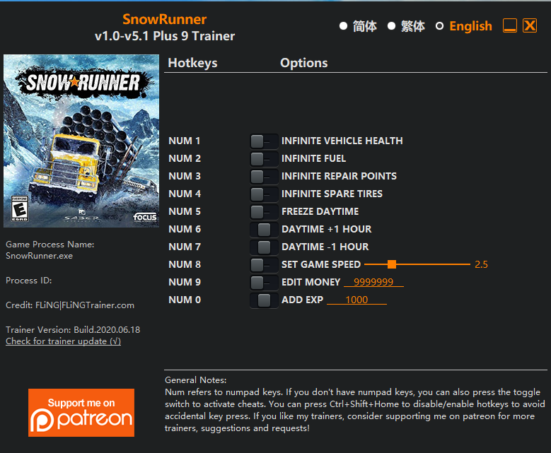 아래와 같이 스노우러너 라는 트럭시뮬레이션게임의 기본 내부 연료상태, 돈무제한, 계속 낮모드 등등 옵션을