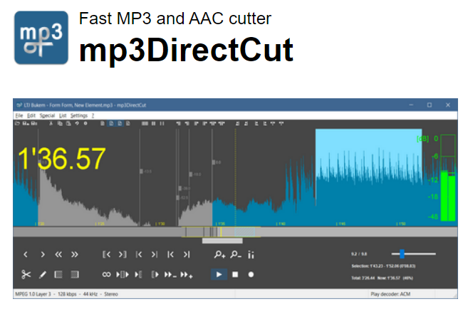 mp3DirectCut은 인코딩된 MP3 및 AAC를 위한 빠르고 광범위한 오디오 편집기입니다.