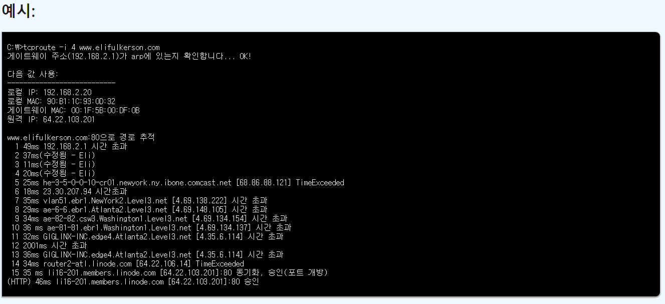 그러나 웹페이지 80포트 또는 https 443포트를 열어놓은 서버의 경로를 체크할때 특정포트를 달고 traceroute를 할