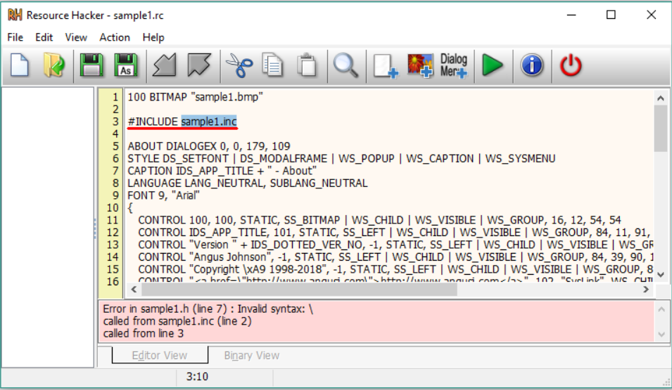 Resource Hacker 컴파일러의 추가 기능은 다음과 같습니다. #INCLUDE 지시문(헤더 파일 등의 정의문에 액세스하기 위해)은 #IF 및 #IFDEF 지시문처럼 여러 수준으로 중첩될 수 있습니다. #DEFINE, #UNDEF, #IF, #ELIF, #ELSE, #IFDEF, #IFNDEF, #INCLUDE 및 #PRAGMA 지시문이 모두 지원됩니다. 큰따옴표(") 문자 사이의 문자열에는 \t , \n , \\ , \" , \x, \u 및 \377(8진수)과 같은 일반적인 'C' 스타일의 백슬래시 '이스케이프' 문자가 포함될 수 있습니다. 문자열 내의 큰따옴표는 선행 백슬래시나 다른 큰따옴표를 사용하여 '이스케이프'해야 합니다. 스크립트 주석 앞에는 이중 슬래시(//) 또는 세미콜론(;)이 옵니다. 상대 경로가 있는 파일 이름이 허용됩니다. 공백이 포함된 파일 이름은 큰따옴표로 묶어야 합니다.