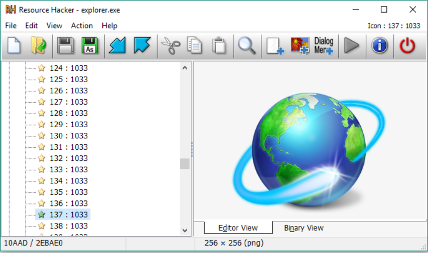 리소스 파일이 열리면 해당 리소스는 일반적으로 이미지(또는 이미지 그룹) 또는 디컴파일된 텍스트로 표시됩니다. 바이너리 리소스, 일반적으로 이미지는 Resource Hacker로 직접 편집할 수 없지만 외부 이미지 편집기에서 수정한 후에는 여전히 매우 쉽게 내보내고 가져올 수 있습니다. (타사 이미지 편집기가 잘하는 것을 복제하는 데 아무런 이점이 없습니다.)