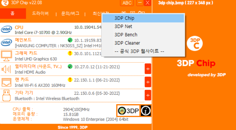 프로그램명 : 3DP Chip (3DP 칩) 설명 : 저용량 파일로서 윈도우 설치 후 드라이버 설치 혹은 드라이버 업데이트, 시스템 사양 확인시 쉽게 사용 가능합니다. 특징 : CPU, 메인보드, 그래픽, 사운드, 기