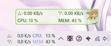 修正Windows11 22H2版本中任务栏窗口位置不正确的问题。 修正Windows11下任务栏窗口显示在左侧时会和系统自带的小组件重叠的问题。 新增CPU频率的显示。 修正主窗口网速单位缺少“/s”的问题。