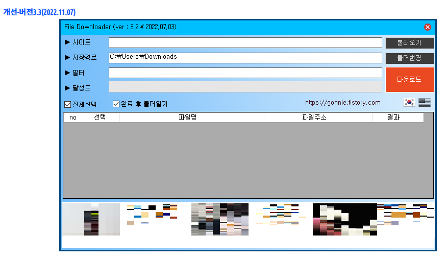 버전 3.3 다운로드 버전 2.12 다운로드 개선-버전3.3(2022.11.07) 1. 티스토리 파일 다운로드 방식 변경에 대응 ※ 3.3버전만 변경된 방식에 대응, 2.12버전은 대응 없음 (과거내용 더읽기) 개선-버전3.2(202