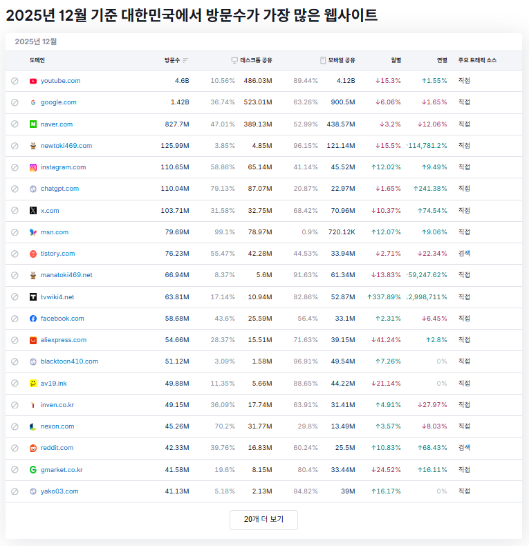 2025년 12월 기준 대한민국에서 방문수가 가장 많은 웹사이트